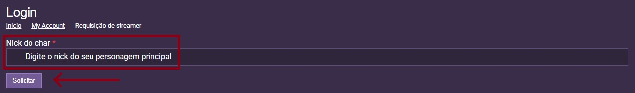 3º - Você então deverá digitar o nickname de seu personagem principal e clicar em "Solicitar":